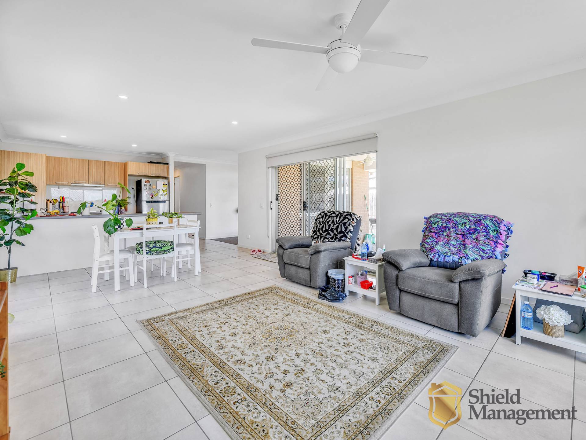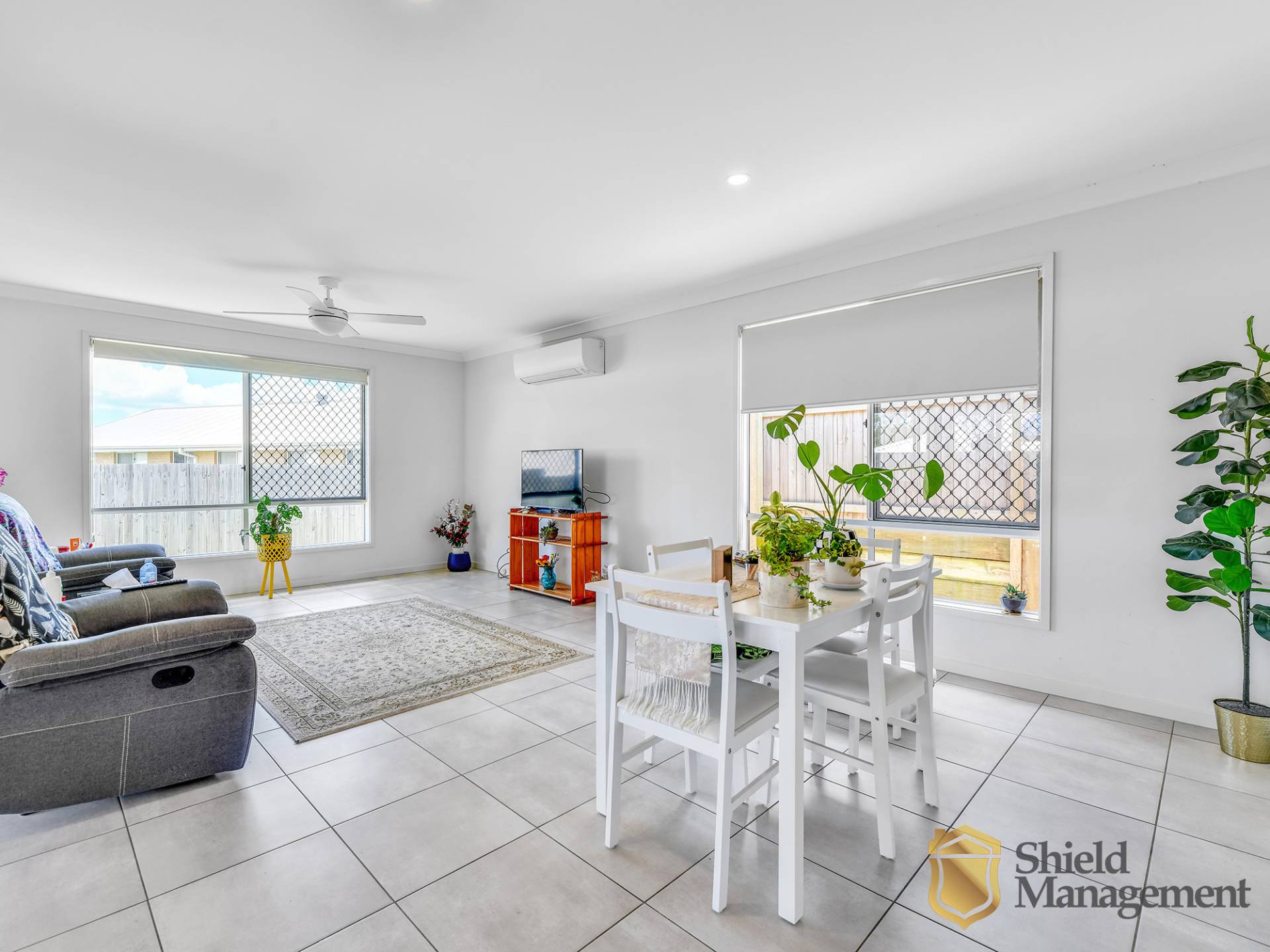 Open plan dining/living room with air-conditioned comfort, ceiling, fan, security screens, roller blinds and access to rear covered alfresco dining area